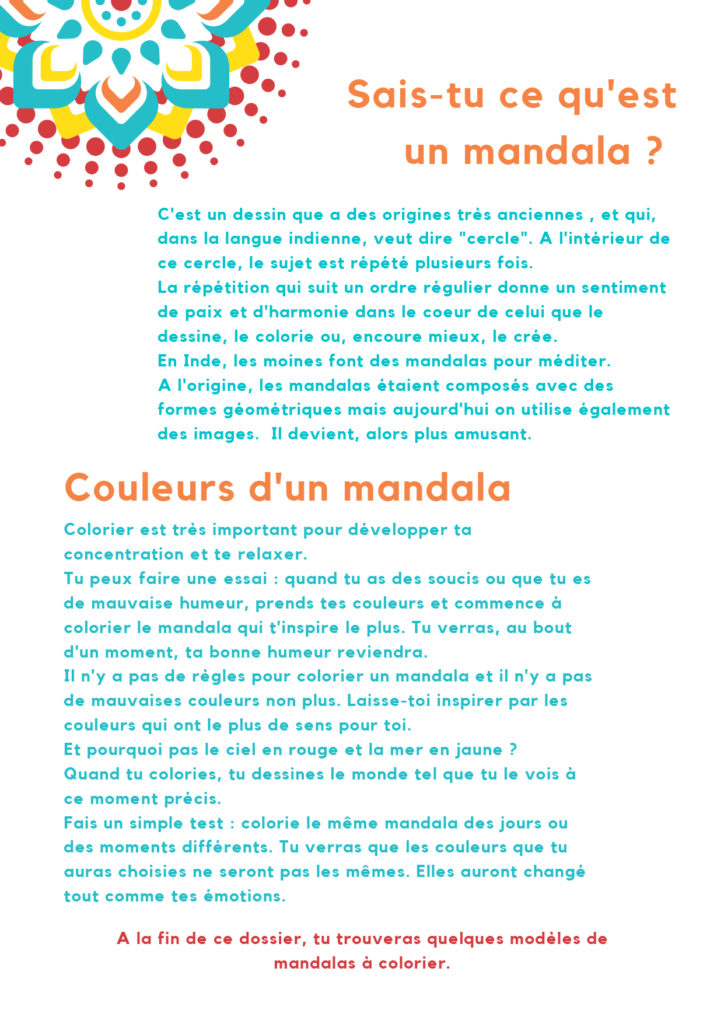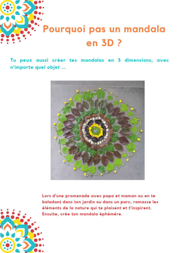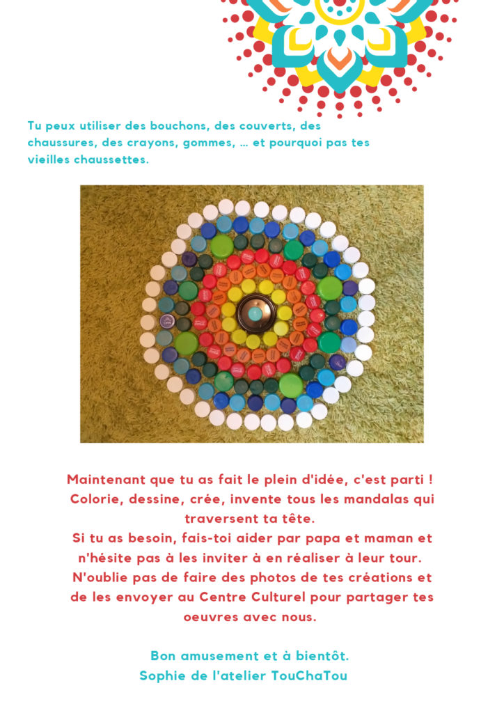 En cliquant sur ce lien :  Activité Mandala vous découvrirez un sympathique dossier dédié à l’art du Mandala. Un petit bout d’histoire et des activités créatives à faire dedans ou dehors, avec divers matériaux de votre choix. C’est parti, votre imagination n’a pas de limites, laissez-là filer ! Des gabarits existent à foison sur internet, choisissez celui qui vous convient le mieux et envoyez-nous des photos de vos œuvres «mandalesques» sur info@leroeulxculture.be.