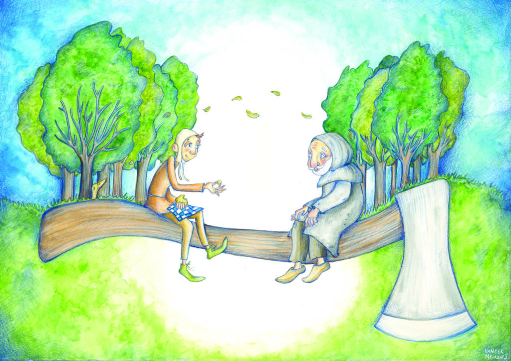 – “Je hebt een goed hart,” zei de kleine oude man na de maaltijd. “Ik ga je een geschenk geven om je te bedanken voor je goedheid. Op de open plek in het bos waar je gaat werken, staat een heel oude boom. Kap hem om! Tussen de wortels zal je een schat vinden.”