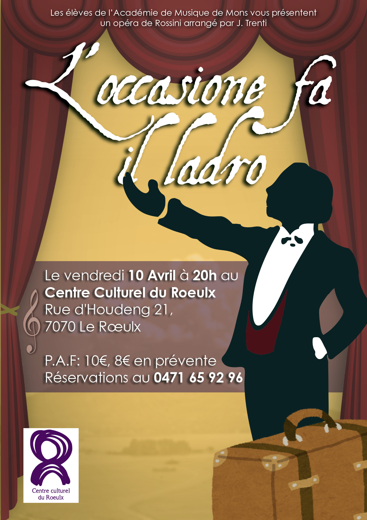 << Agenda Opéra | Rossini – L’occasione fa il ladro 10 avril 2026 Les élèves de l’Académie de Musique de Mons vous présentent un opéra de Rossini arrangé par J. Trenti L’occasione fa il ladro Vendredi 10 avril à 20h Au Centre culturel du Roeulx PAF : 10€ guichet / 8€ prévente Réservations au 0471 / 65 92 96 Parlez-en sur Partager cet événement 6157861 Détails Date : vendredi 10 avril 2026 Heure : 20h00 » 21h00 Prix : 8€ à 10€ Catégories d’Évènement: Concerts, Spectacle Lieu Centre culturel du Roeulx Rue d’Houdeng 27 Le Roeulx, 7070 Belgique + Google Map Phone 064 66 52 39 + Google Agenda+ iCal Export Evénements similaires Jeune public | Carapaces (Scolaire) mardi 10 février 2026 - 10h30 » 11h30 IMPRO | No[us] (Scolaire) jeudi 26 mars 2026 - 13h30 » 14h30 IMPRO | No[us] jeudi 26 mars 2026 - 20h00 » 21h00 « IMPRO | No[us] Jeune public | Camping Cosmos (Scolaire) »